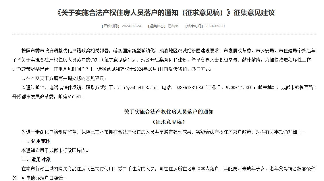日前,成都市《关于实施合法产权住房人员落户的通知(征求意见稿)》完成了意见征集。